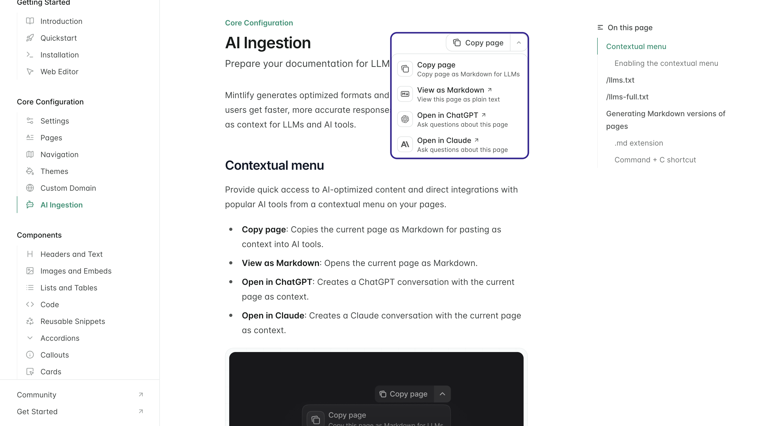 LLMs like GPT-4 and Claude can use your docs to generate code, write tests, or suggest integrations, helping users solve problems faster. That's why all Mintlify-powered docs are optimized for LLM consumption using our AI Ingestion feature.