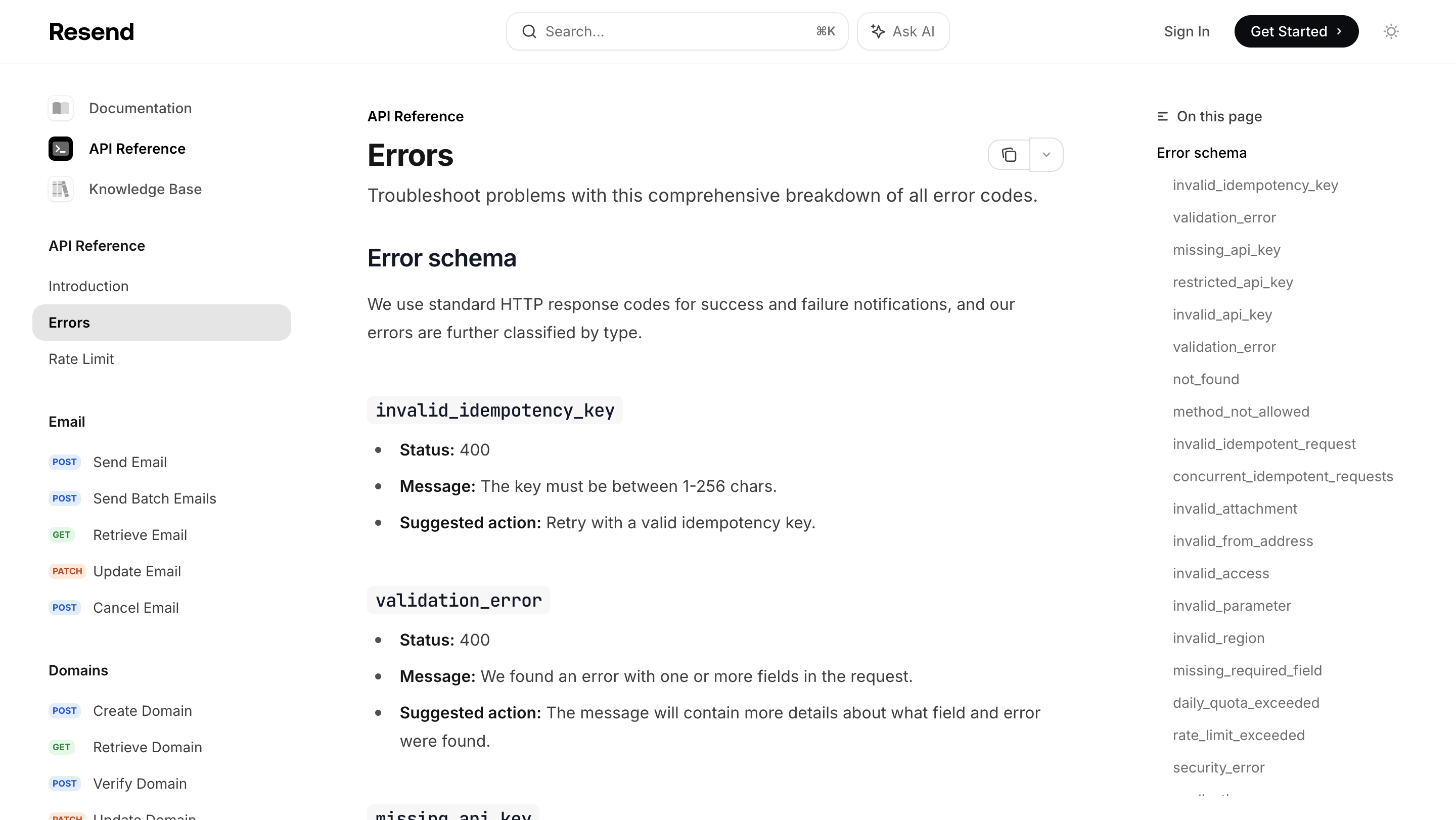 Document every error code your API can return, with context, and offer actionable guidance on how to fix these errors. For example, what does a 403 mean in your system? What's the difference between a 400 and a 422?