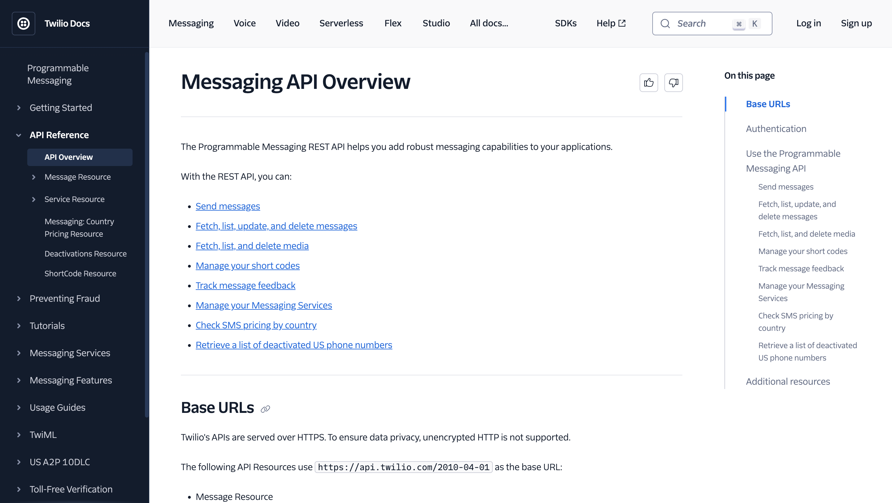 Twillo documentation showing how the API reference is structured for real-life use cases