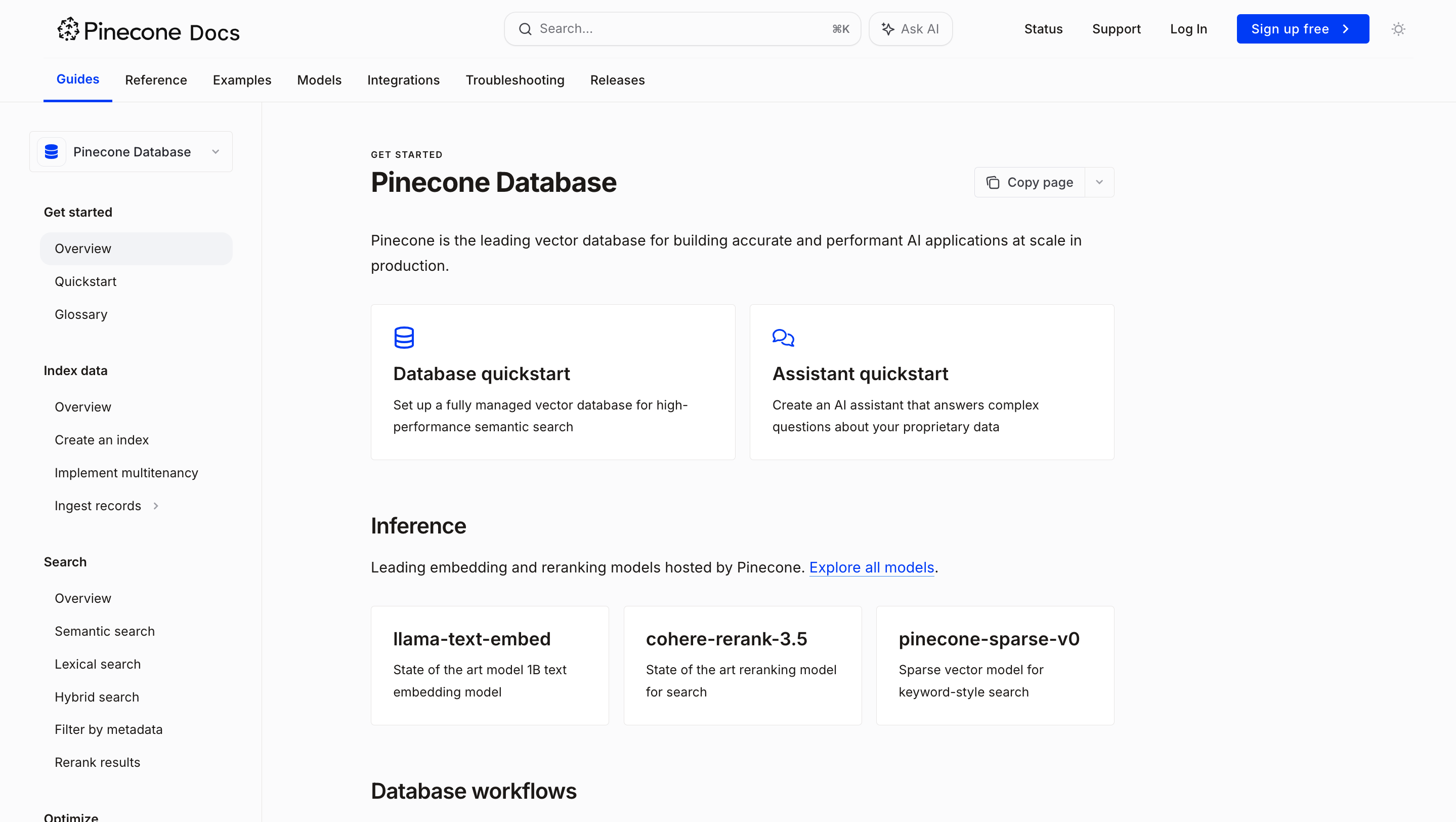 Pinecone's documentation is another standout in terms of DX. It's clearly built by people and tools that understand that documentation facilitates cross-team collaboration. It features: