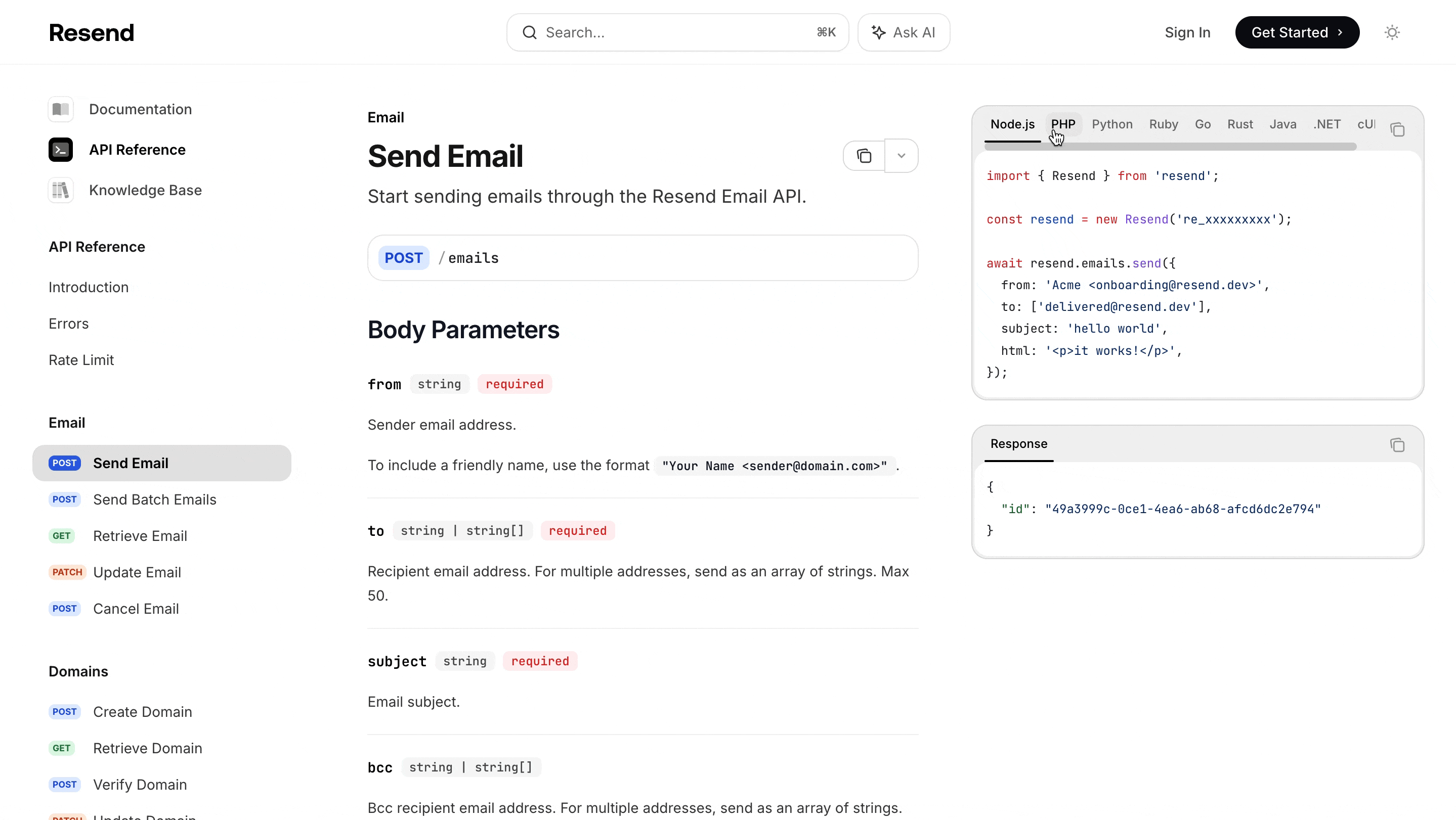 Resend uses Minlify's tabs to display code examples in multiple programming languages, alongside their corresponding responses. This makes it easy for developers to copy, paste, and follow along regardless of the language they're using.